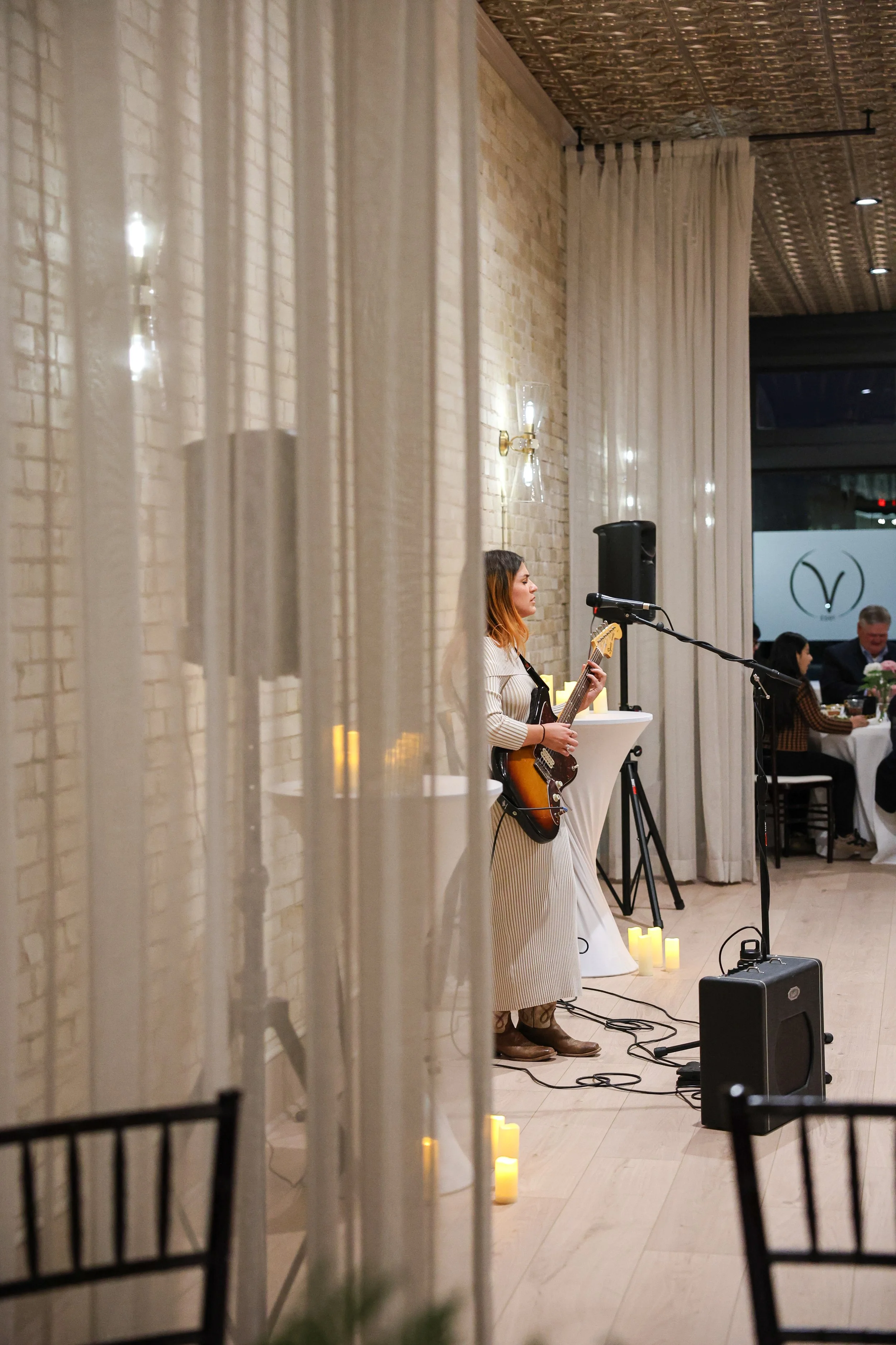 The space is intentionally prepared with the essentials already in place, including tables, linens, Chiavari chairs, a built-in bar, and a caterer’s kitchen, so hosting feels seamless from the start. More than anything, they wanted to create a space that feels good to be in, one that holds conversation well, welcomes people in, and becomes part of the memory itself.